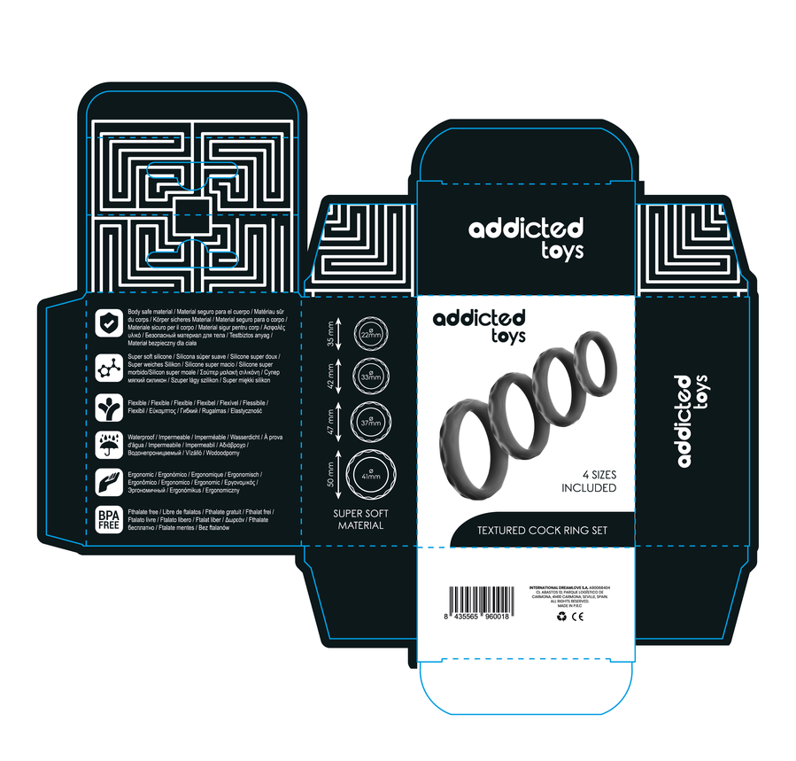 El set incluye cuatro anillos de diferentes tamaños —22 mm, 33 mm, 37 mm y 41 mm— para adaptarse a las distintas necesidades y preferencias de cada usuario. Gracias a su diseño ergonómico y texturizado, cada anillo proporciona un ajuste firme y seguro, intensificando la estimulación tanto para quien los usa como para su pareja.