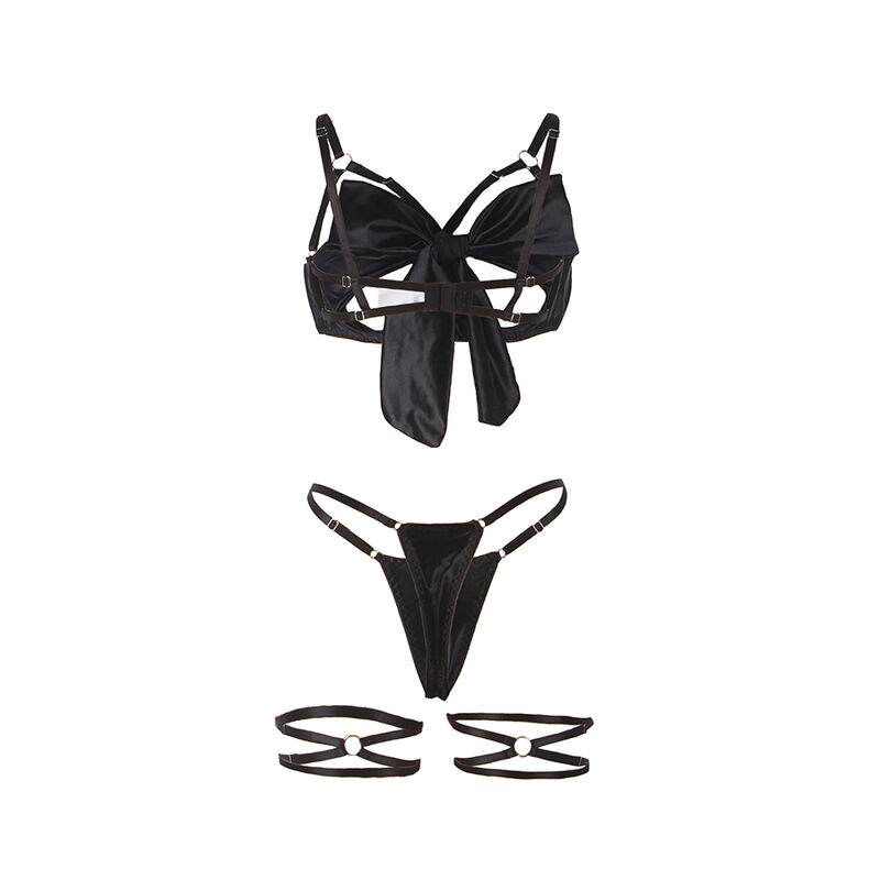 El sujetador cuenta con copas abiertas que realzan el busto de forma delicada, decorado con un coqueto lazo negro que añade un aire juguetón y seductor. Fabricado con un 95% de poliéster y un 5% de spandex/elastano, ofrece un ajuste cómodo y flexible que se adapta a la perfección a las curvas del cuerpo, garantizando comodidad y soporte.
