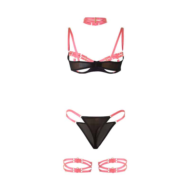 Confeccionado con materiales de alta calidad (95% poliéster y 5% elastano/spandex), este conjunto ofrece una textura suave, gran elasticidad y un ajuste perfecto a las curvas de tu cuerpo. El sujetador presenta un diseño de tiras cruzadas que enmarca y realza el busto, mientras que las transparencias y el contraste de colores en tonos de rosa añaden un aire romántico y sofisticado.