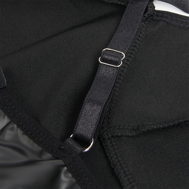 Fabricado con materiales de alta calidad (95% poliéster y 5% elastano/spandex), esta prenda asegura un ajuste cómodo y flexible que se adapta a las curvas de tu cuerpo de manera favorecedora. El acabado en cuero PU aporta un brillo lujoso que realza su carácter provocador, mientras que los tirantes ajustables permiten una personalización perfecta para mayor comodidad.
